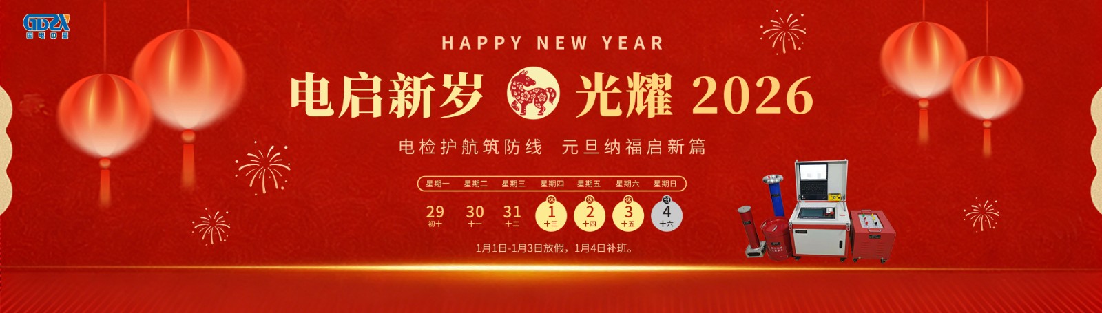 元旦鐘聲送吉祥,喜迎新年新氣象!根據(jù)國家節(jié)假日安排,結(jié)合公司實際情況,2026年元旦節(jié)放假安排如下:放假時間:2026年1月1日-1月3日放假,共3天。1月4日(星期日)正常上班。如有業(yè)務(wù)事宜請與相關(guān)業(yè)務(wù)人員聯(lián)系,相關(guān)聯(lián)系方式如下:1、產(chǎn)品和服務(wù)咨詢熱線:400-0828-027 / 132941535862、電氣試驗技術(shù)咨詢熱線:186071457333、售后服務(wù)專線:027-65526006萬象更新迎元旦,愿您新年新起點,事業(yè)順?biāo)欤T事皆圓!——【武漢國電中星...